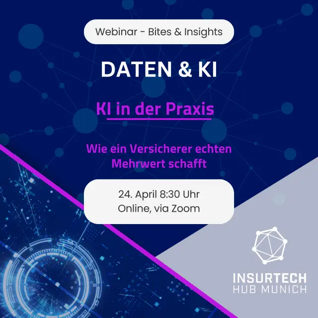 Webinar: KI in der Praxis – Wie ein Versicherer echten Mehrwert schafft April 24, 2025 Webinar / Online Event-Details Start: Donnerstag, 24.4.2025 - 08:30 Ende: Donnerstag, 24.4.2025 - 09:30 Standort: https://lu.ma/qwf0u1z6 Veranstalter: InsurTech Hub Munich Kategorie: Webinar / Online